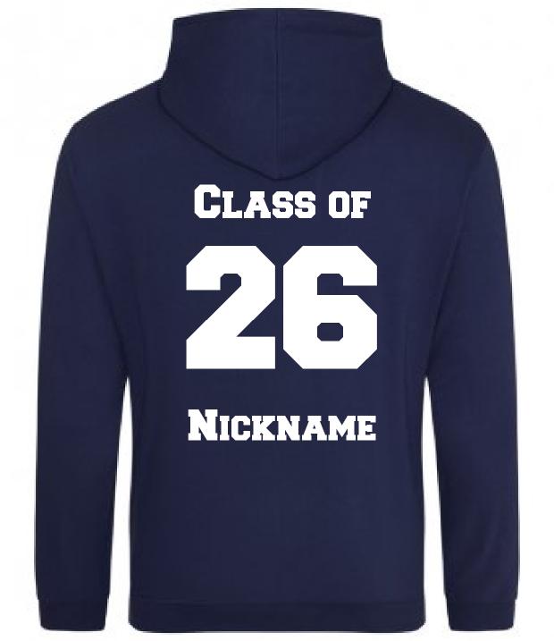 Includes Benton Dene embroidered logo on front and number 26 print made up of students names on back. Option to add Individual NAME or NICKNAME to the back of the Hoody.